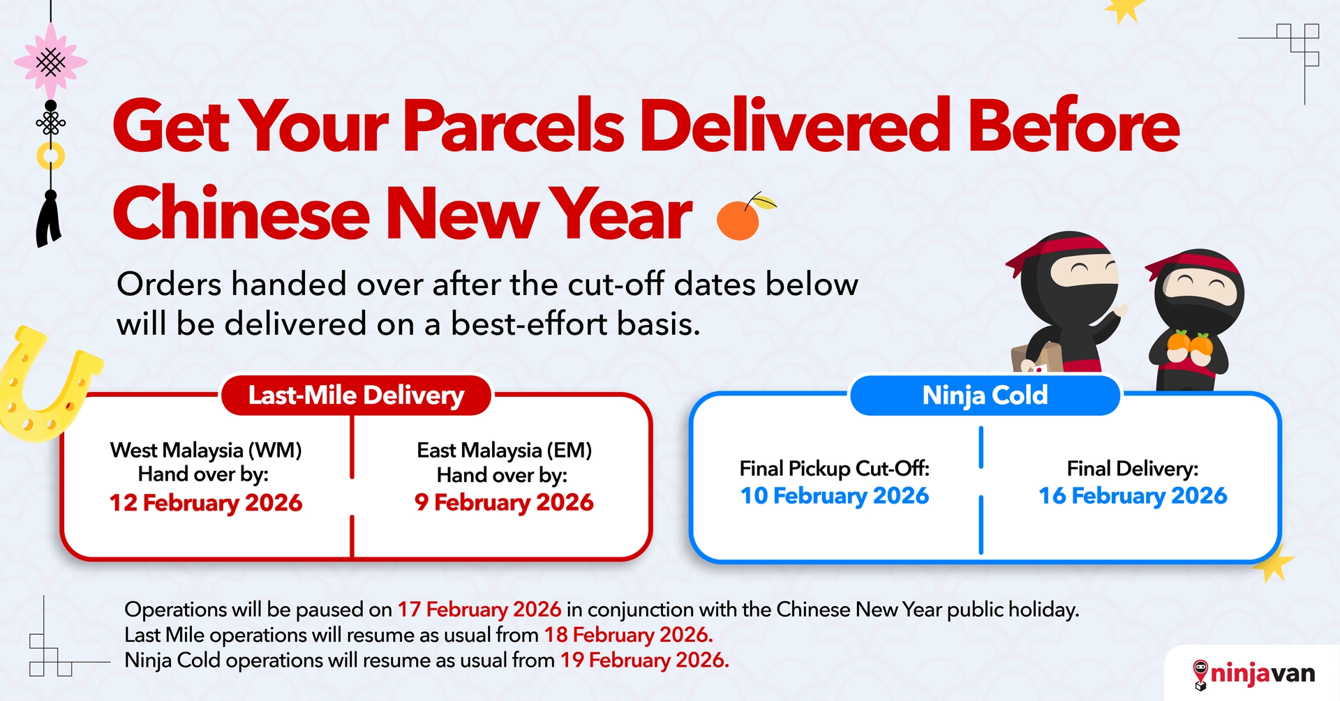 The following cut-off dates and procedures apply to both Last-mile Delivery and Ninja Cold services. We encourage all shippers to plan their handovers according to the service types below to ensure delivery by 16 February 2026 (CNY Eve).
