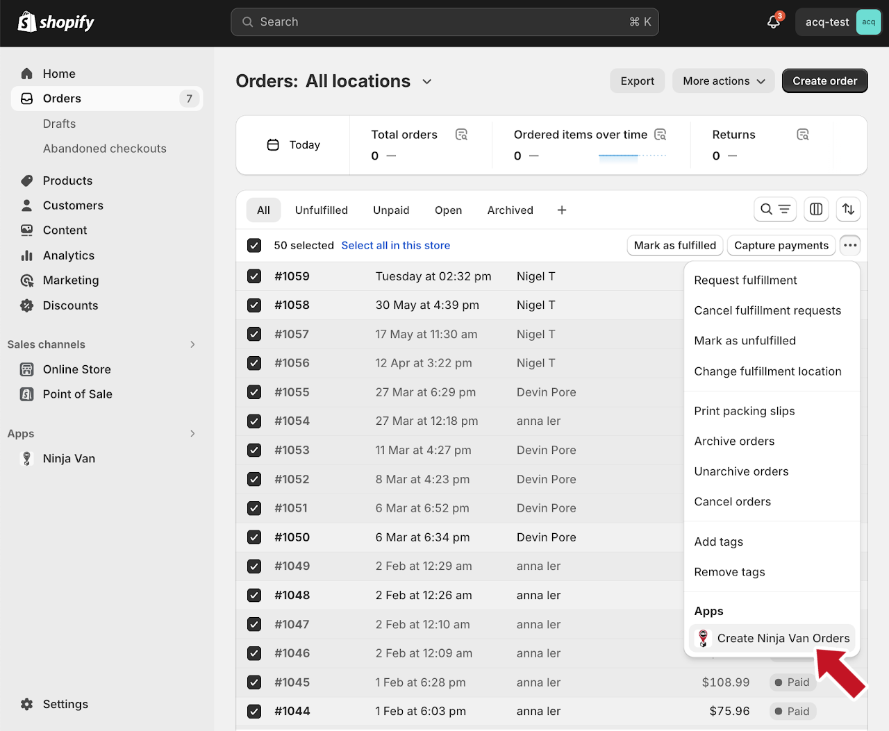 - Select the order(s) that you’d like to fulfil with Ninja Van.