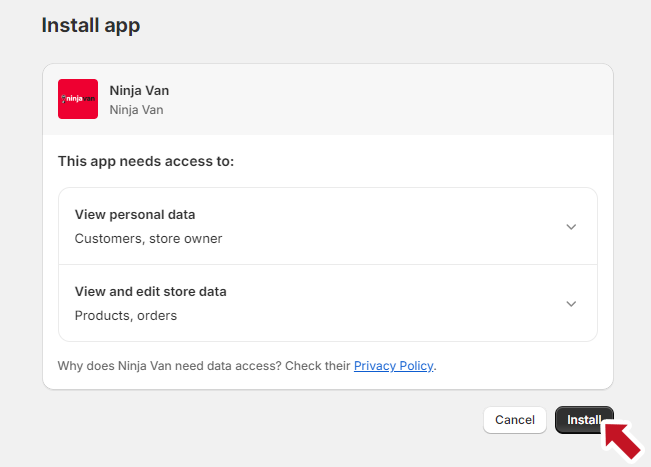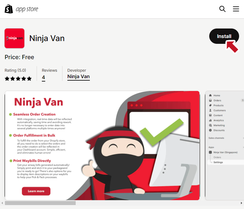 - Click Install on Shopify admin. You will need to be logged into Shopify for this step.
