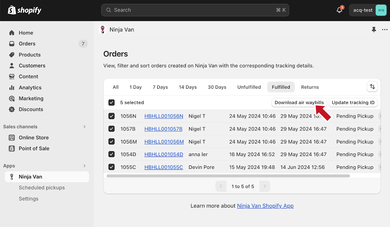 Print shipping labels/air waybills from the Ninja Van Shopify app