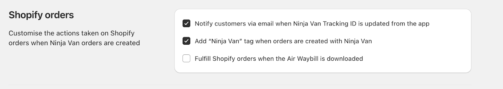 - You may choose to toggle "Fulfill Shopify orders when the Air Waybill is downloaded”.