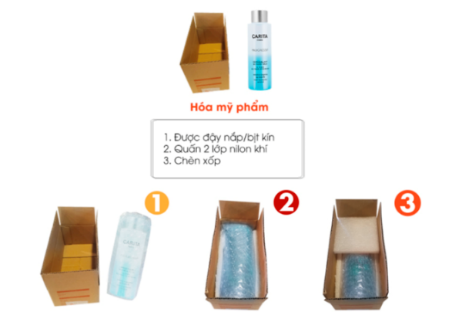 | Cosmetic | A. Each product needs to have its bottle tightly sealed with tape/food wrap, then wrap two layers of bubble wrap around the product to secure the product lid. B. In the case of multiple bottles in one order, they must be separated by air cushioning or elastic materials inserted tightly between the gaps to prevent the products from shifting and colliding during transportation, such as air cushioning, foam, foam peanuts. C. In the case of products inside manufacturer boxes/cases: Wrap the manufacturer's box/case with 3-5 layers of bubble wrap and secure the bubble wrap with tape. D. In the case of products inside plastic trays/shrink wrap: Require foam padding on both the bottom and top, then place them in a separate carton box. E. There should be warning labels for liquid items (labels facing upwards) or fragile items. | ![]() |