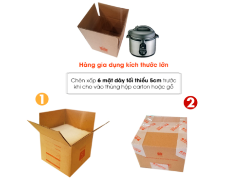 | Household Appliances | A. Insert additional 6-sided foam products with a minimum thickness of 5cm around before putting in the container. B. In the case of large-sized household appliances, it is recommended to insert foam with a thickness of 5 cm or more around the product before packing it into the shipping box. It is advisable to use a 3-layer carton box and seal the folds of the box with tape to ensure safety during transportation, for example, induction hobs, rice cookers. C. The carton box should be made of 3-layer cardboard to ensure safety during transportation. D. The joints and folds need to be thoroughly sealed with tape. | ![]() |